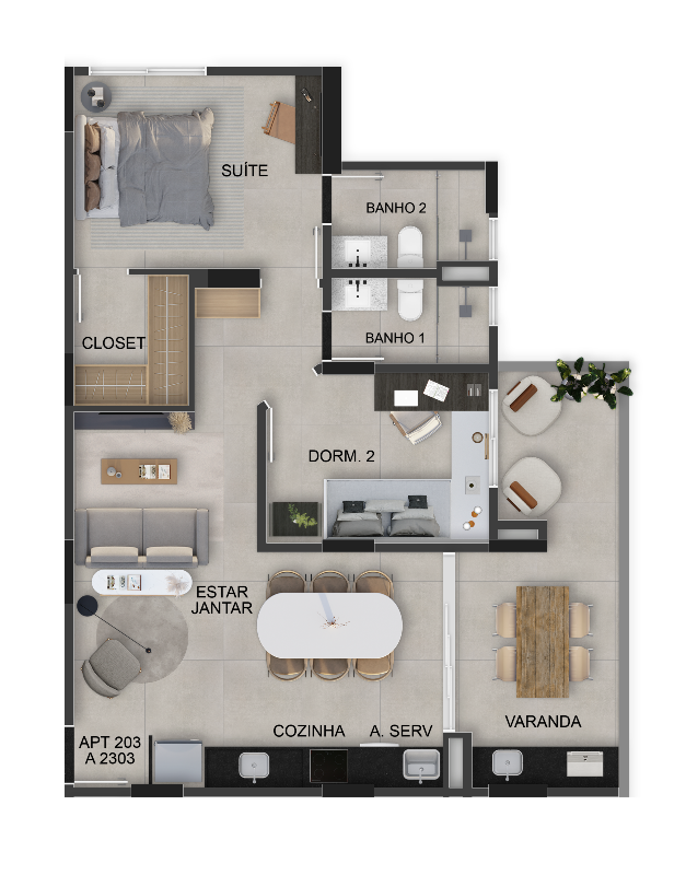 2 quartos, sendo 1 suíte com closet