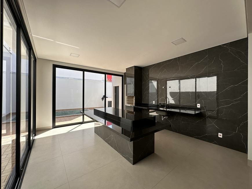 Cozinha americana com ilha e churrasqueira à carvão.