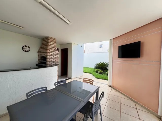 Varanda com churrasqueira, balcão e banheiro social