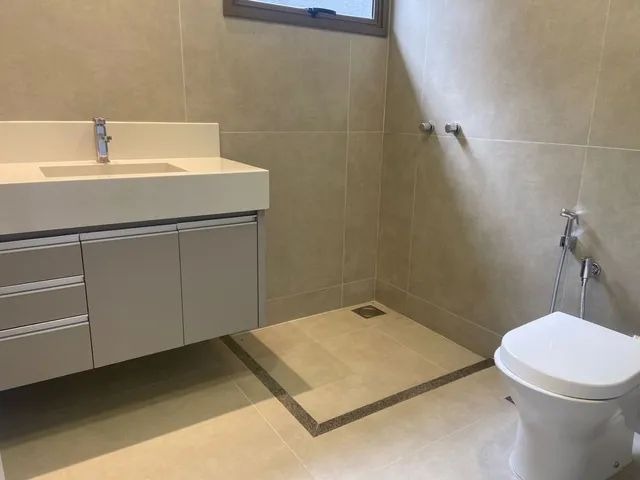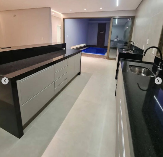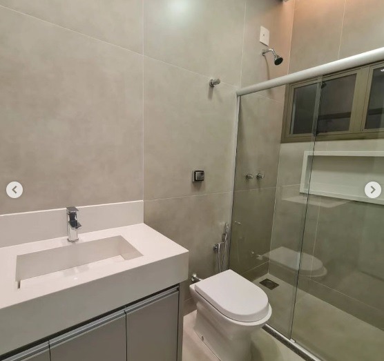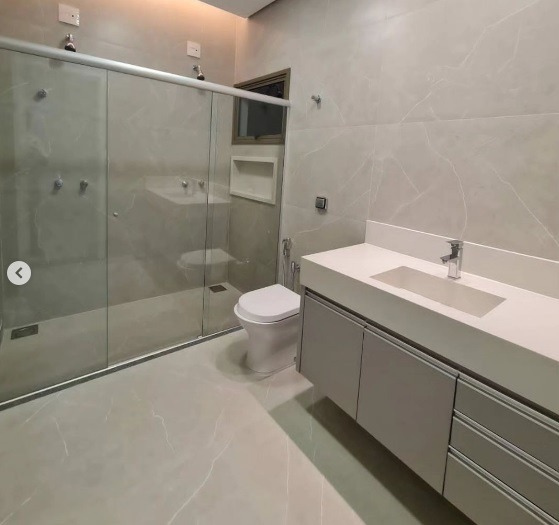3 suítes, sendo 1 com closet, banheiro com cuba de mármore esculpido e duas duchas